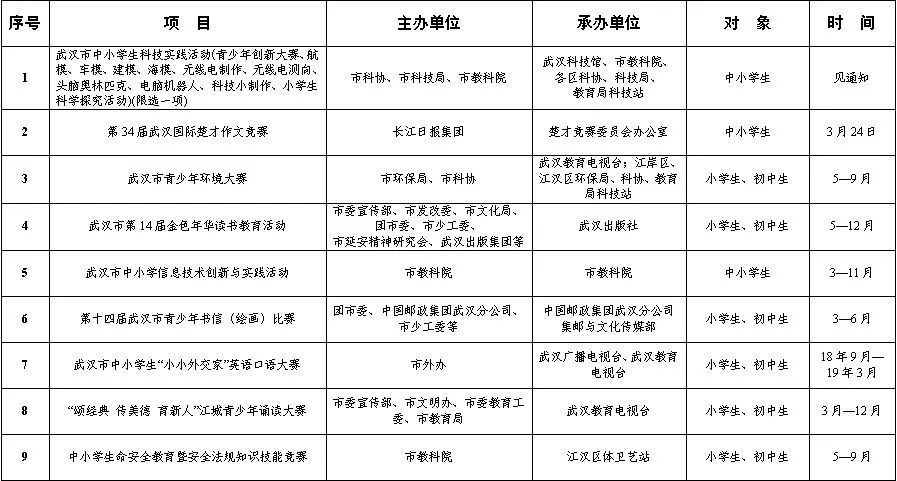 3月24日,“楚才”正式开赛!你想知道的赛事信息都在这里 ▲2018年武汉市中小学生竞赛项目表开学了!楚才赛季也开启啦!我们即将踏入阳春三月。祝愿天下的学子们在新的一年里身体健康,学业旺旺!敲